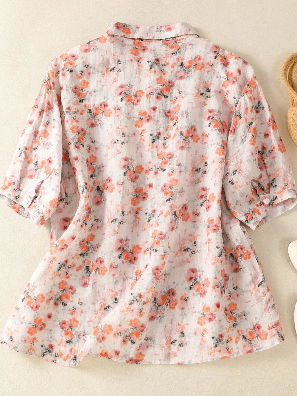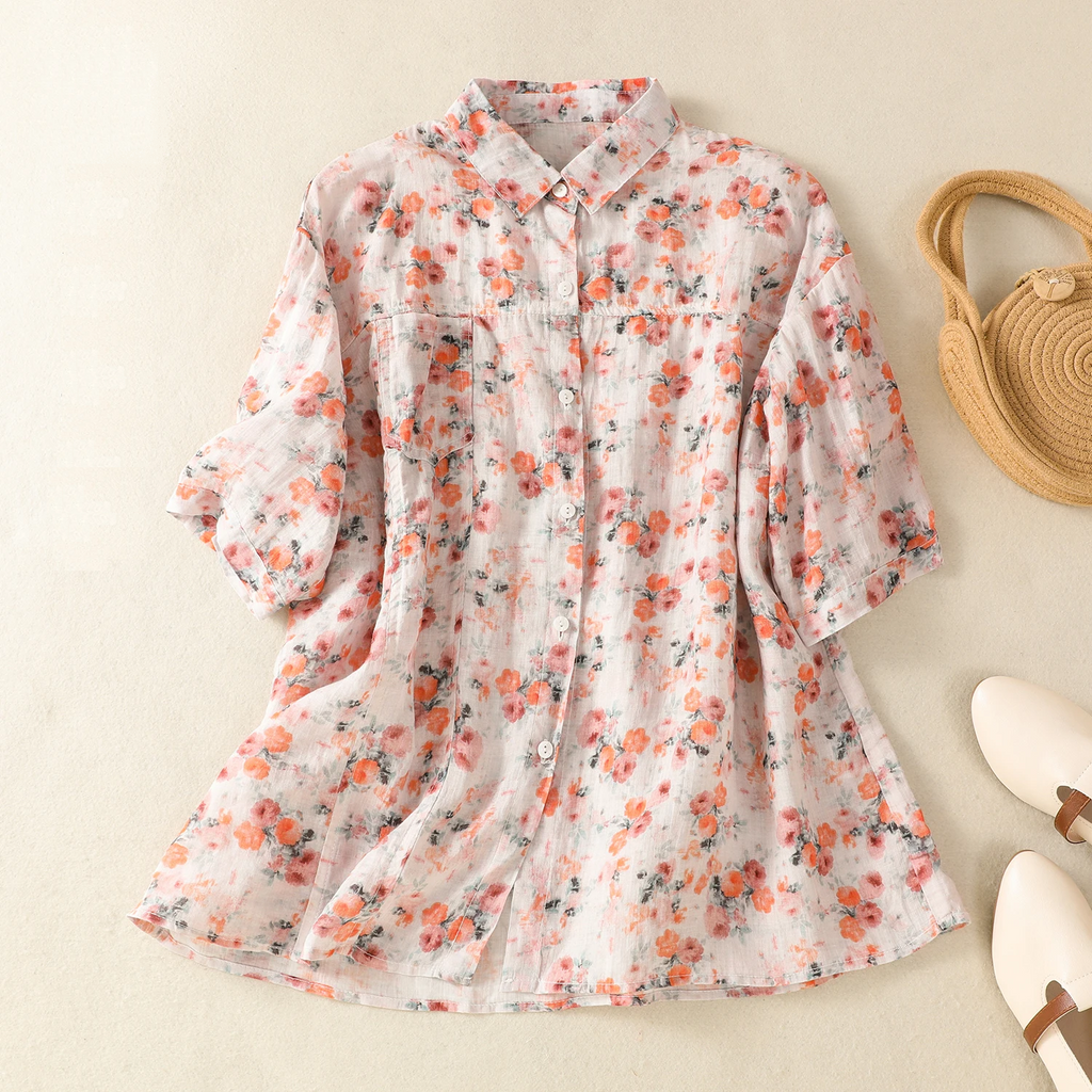 Embrace effortless summer style with this artistic floral cotton linen shirt. Crafted from a breathable cotton-linen blend, it keeps you cool and comfortable in warm weather. The slimming cut flatters your silhouette while the short sleeves offer perfect seasonal coverage. Button closure for easy dressing. Lightweight and versatile, it pairs beautifully with shorts, skirts, or linen pants for casual outings or relaxed gatherings.