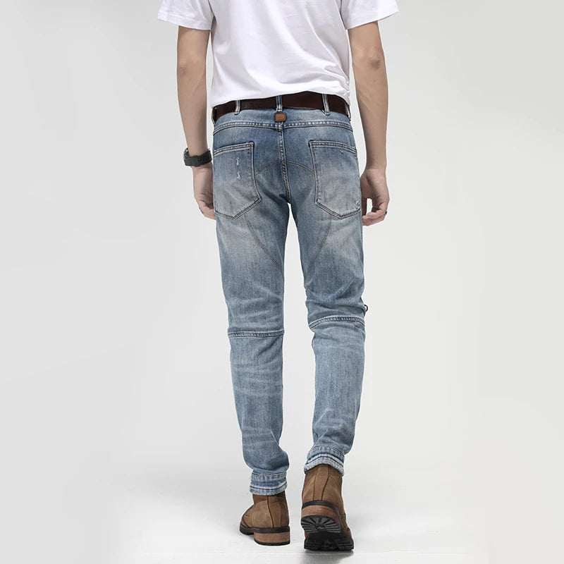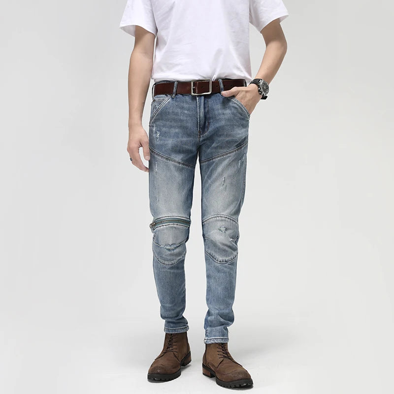 Engineered for riders and style-conscious men, these motorcycle jeans blend rugged durability with contemporary design. The cotton stretch denim offers comfort and flexibility for all-day wear, while strategic splicing and zipper detailing add an edgy aesthetic. The slim fit silhouette flatters without restricting movement, making them ideal for both on and off the bike. Perfect for autumn and winter layering, these jeans deliver the toughness you need with the refined look you want.
