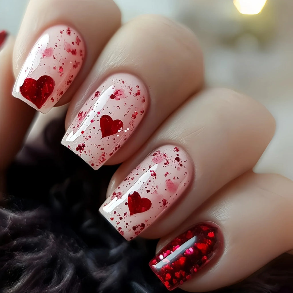 Medium Square nails for women girls gradient red white heart design for Valentine's Day full cover tip press on nail