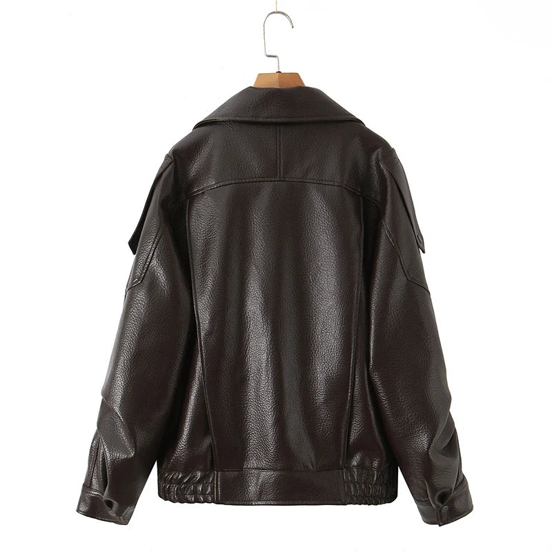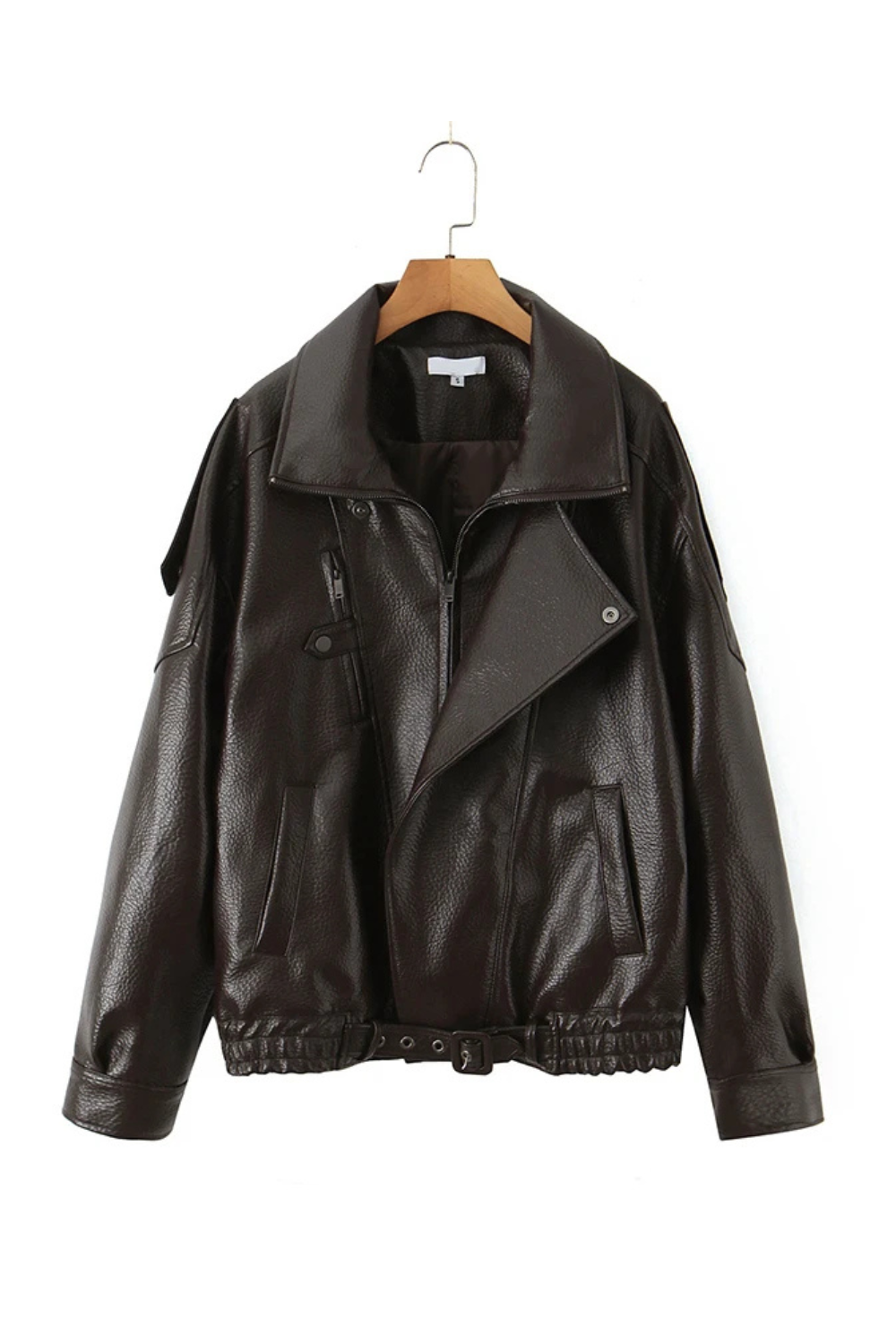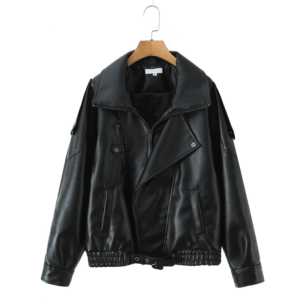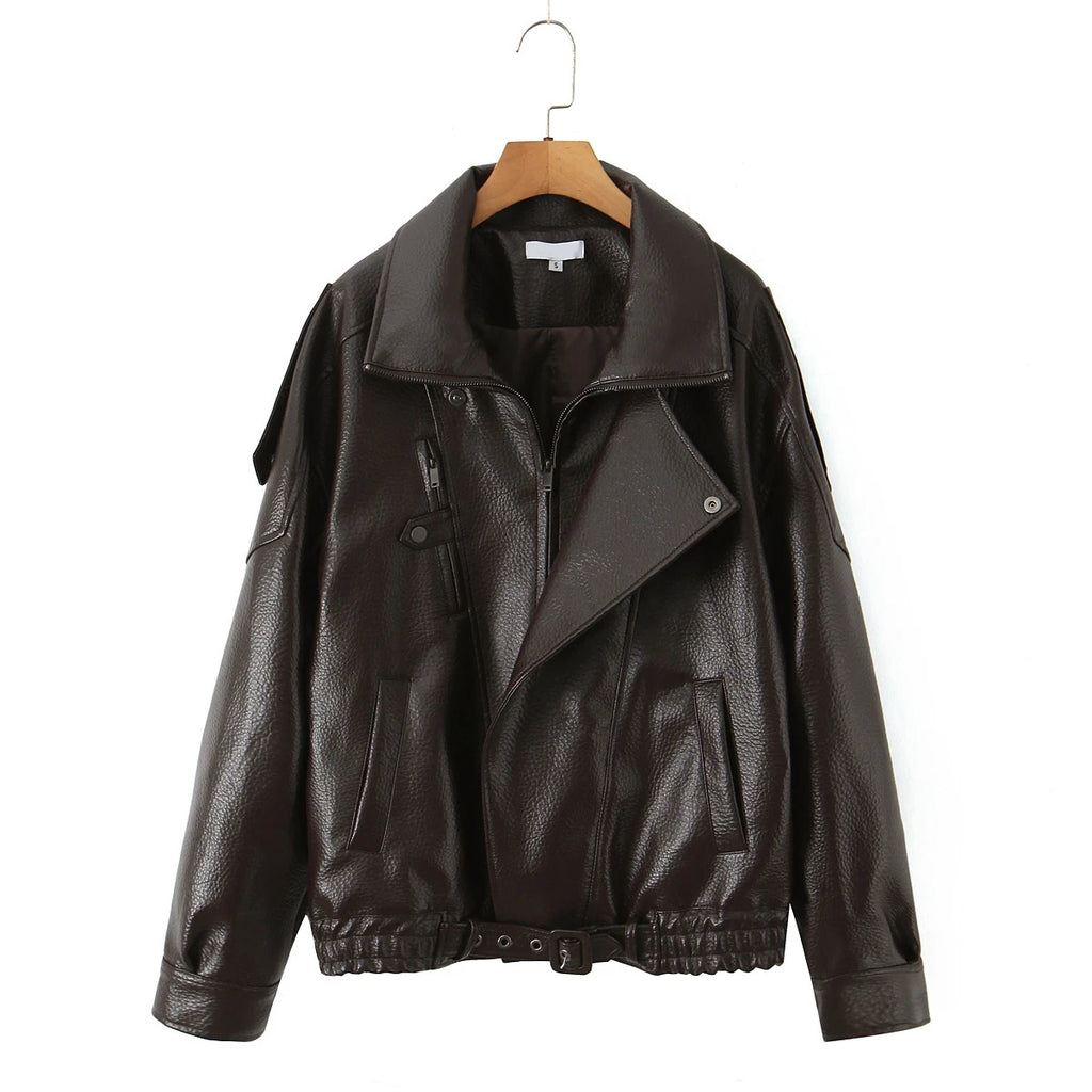 Women Retro Faux Leather Motorcycle Jacket Front Zipper Long Sleeve Lapel Collar Autumn Winter Coat