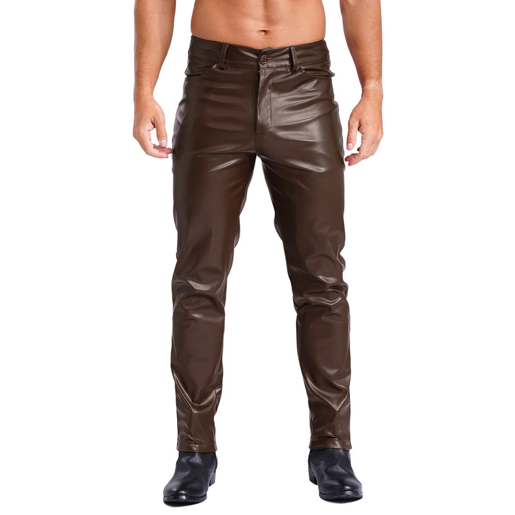 Men Leather Pants Pockets Costume Smooth Lining Straight Pants Tights