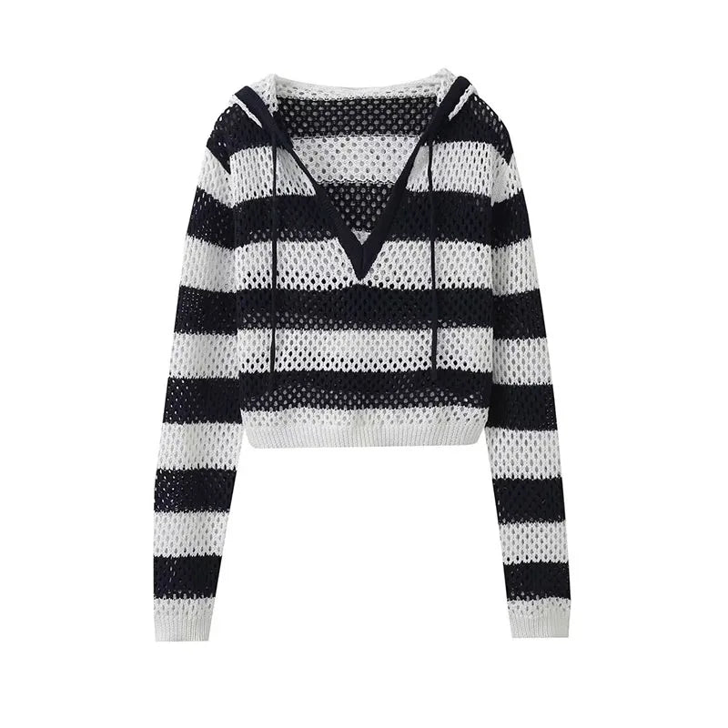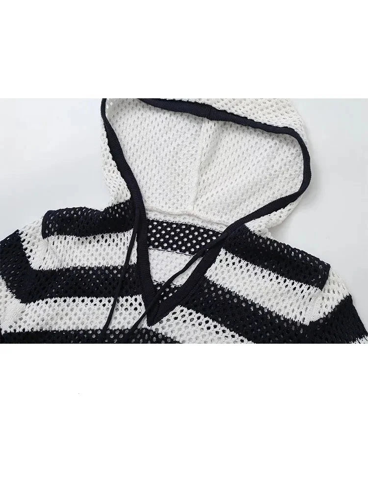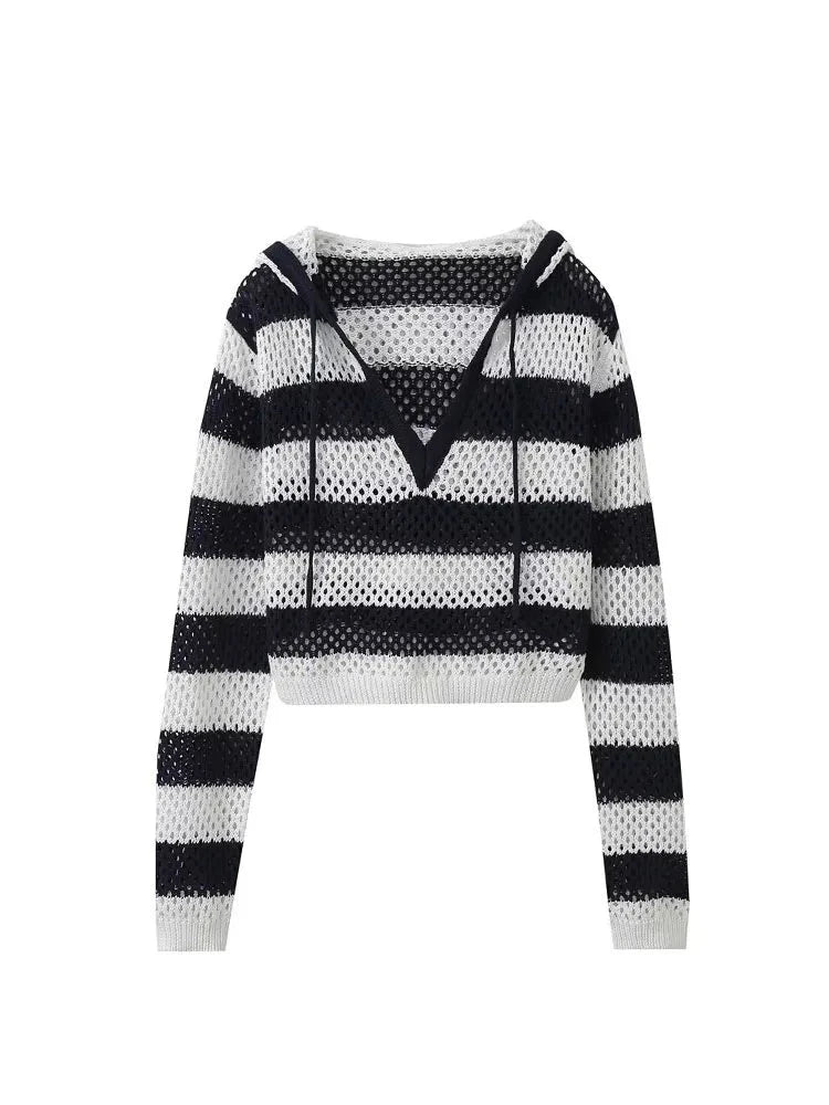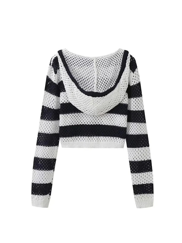 Spring Knitted Tops Woman Trendy Black White Stripes Hooded Hollow Out Female Casual Pullovers