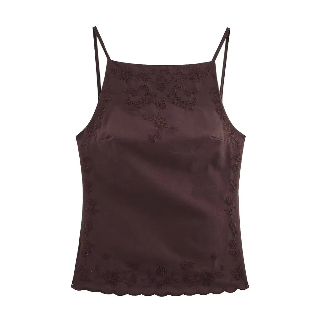 Floral Embroidery Backless Camis Top Women Holiday Summer Brown Tops