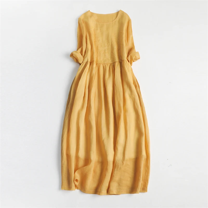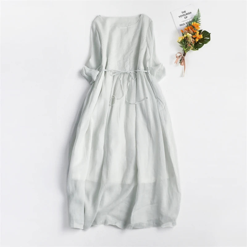 Vintage Embroidery Party Dress Summer Women Half Sleeve Solid Midi Dresses Literary Soft