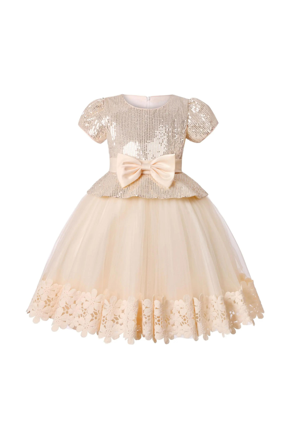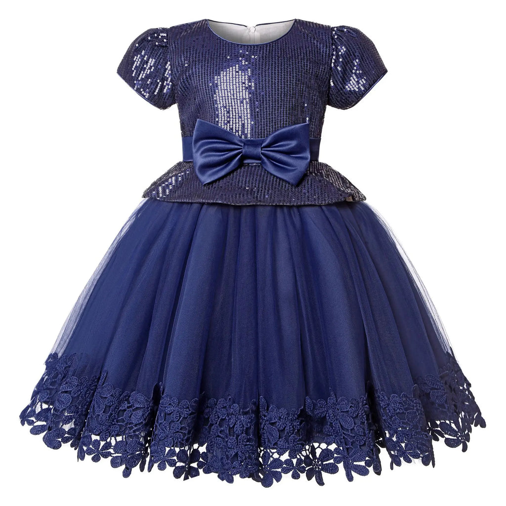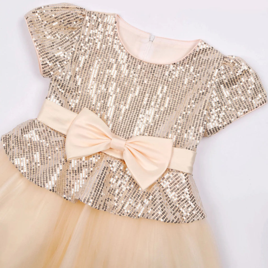 Girl Sequins Christmas Dress Lace Hem Kids Birthday Princess Clothing Toddler Infant Golden Bow Children Gowns