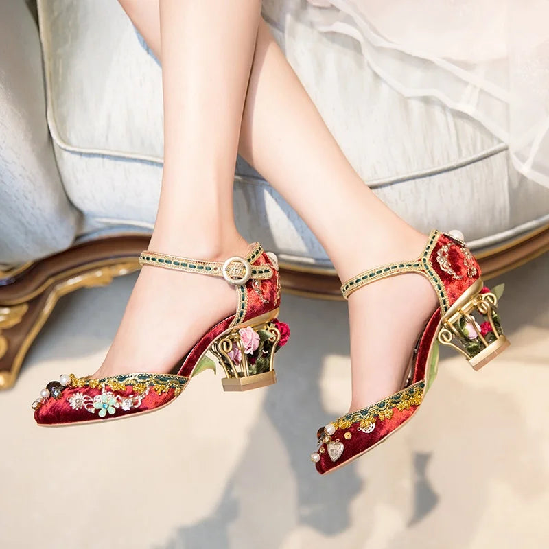 Flower Heels Woman Shoes Retro Birdcage Applique Embroidery Sandals Shoes